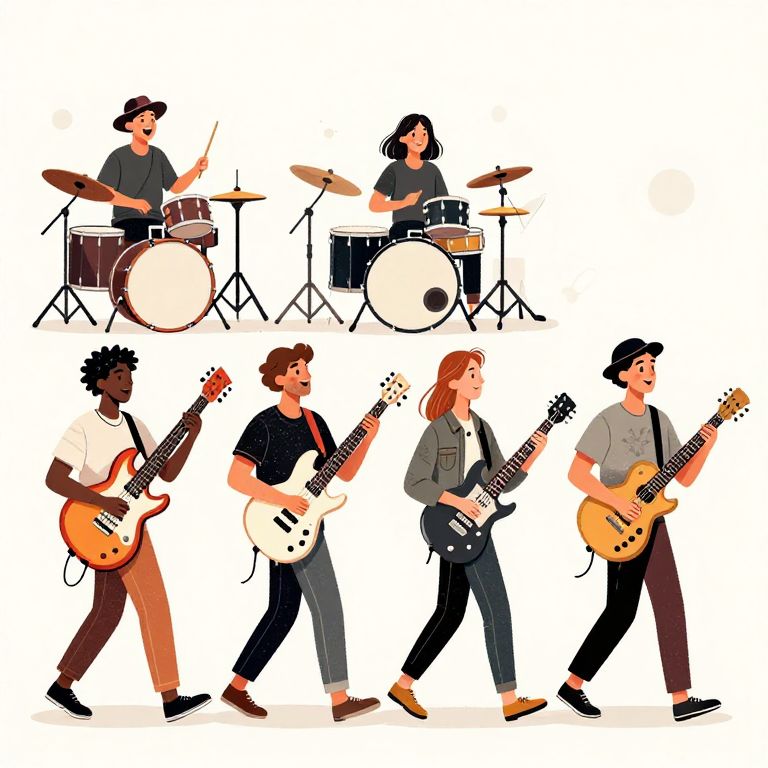 Walk Cycle illustration of a band of 4 people playing bass, singing, keyboard, drum in a happy ambience, with intricate details,