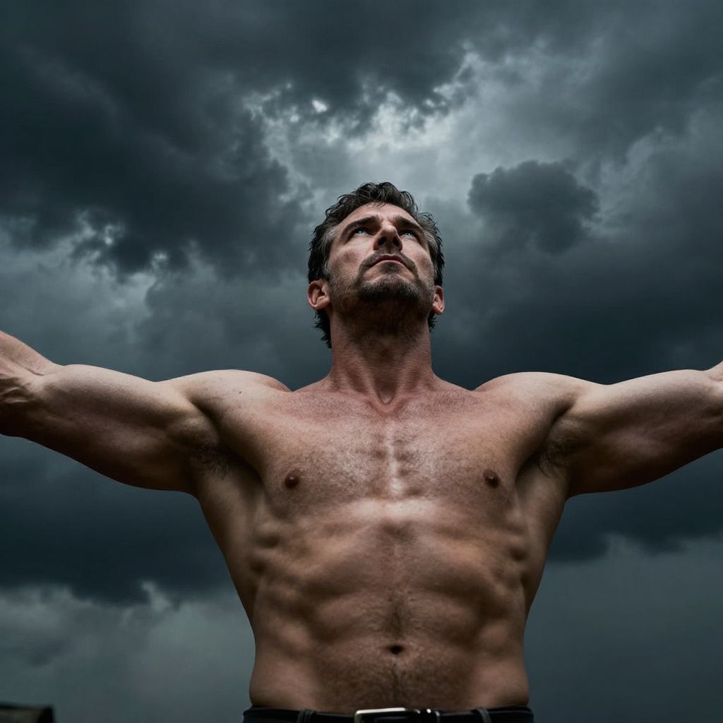 Powerful male figure, broad shoulders, rugged physique, standing tall with arms outstretched, gazing upwards towards an ominous stormy sky, dark clouds gathering above, dramatic lighting, intense atmosphere, deep perspective, cinematic composition, low angle shot from below, emphasizing his strength and dominance. Man has masculine face and piercing eyes