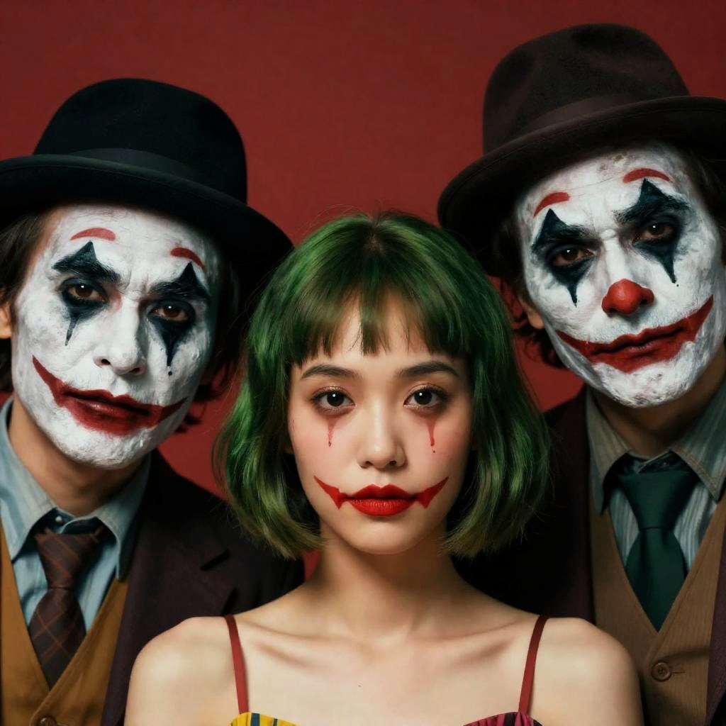 Photograph of three people with intense, clown-like facial makeup. Left: pale skin, black hat, red eyes, black lips. Center: green bob haircut, red cheeks, red lips. Right: weathered skin, black face paint, green tie, hat. Red background.