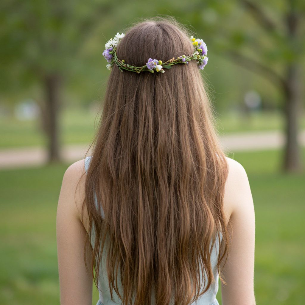 Photograph of a woman with long brown hair, wearing a floral crown, seen from behind in a green, tree-filled park.