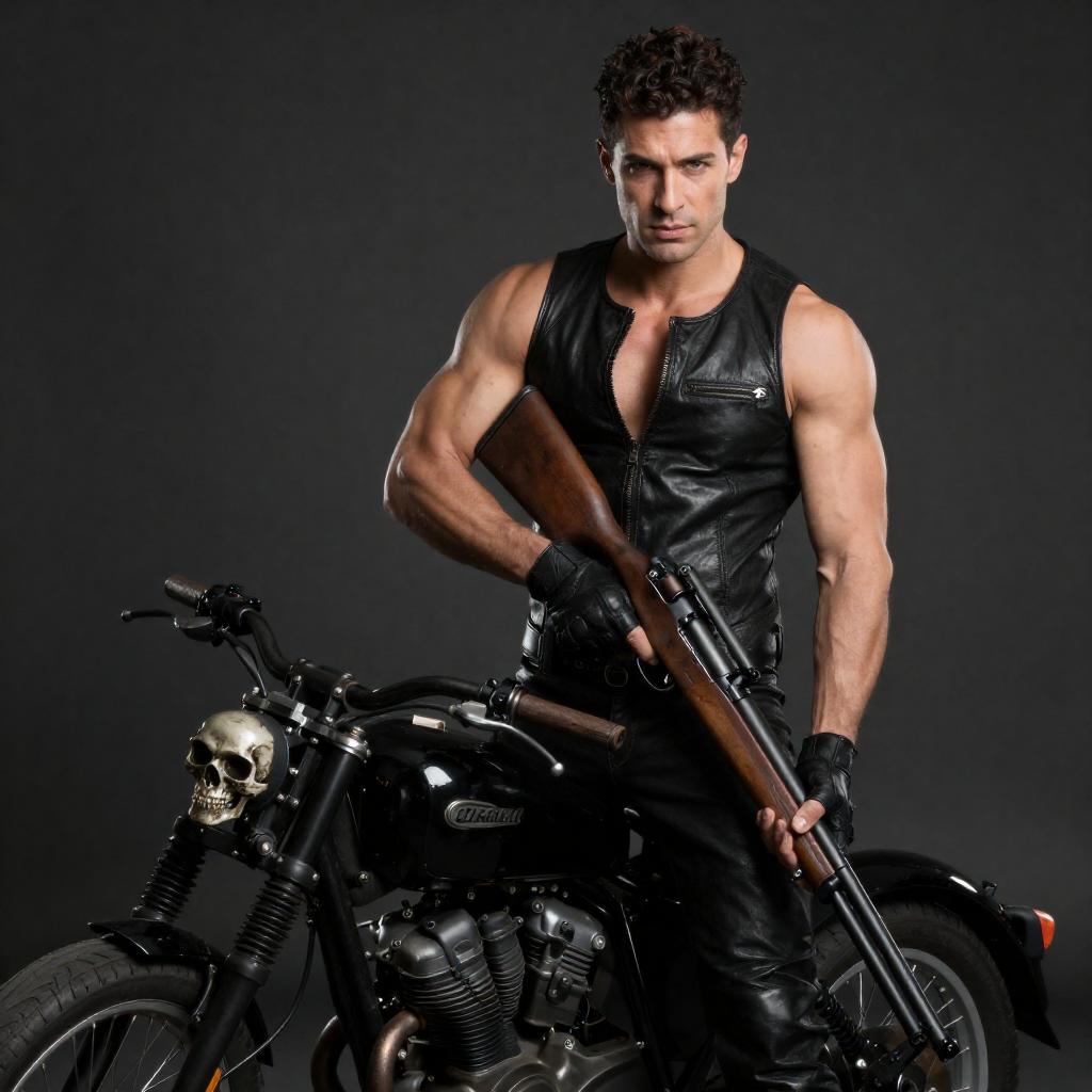 Photograph of a muscular man with short, dark curly hair and intense expression, wearing a black leather outfit and gloves. He holds a rifle with a skull-shaped headlight on a bike. Dark, ured background. Standing pose. Man centered, bike to the left.