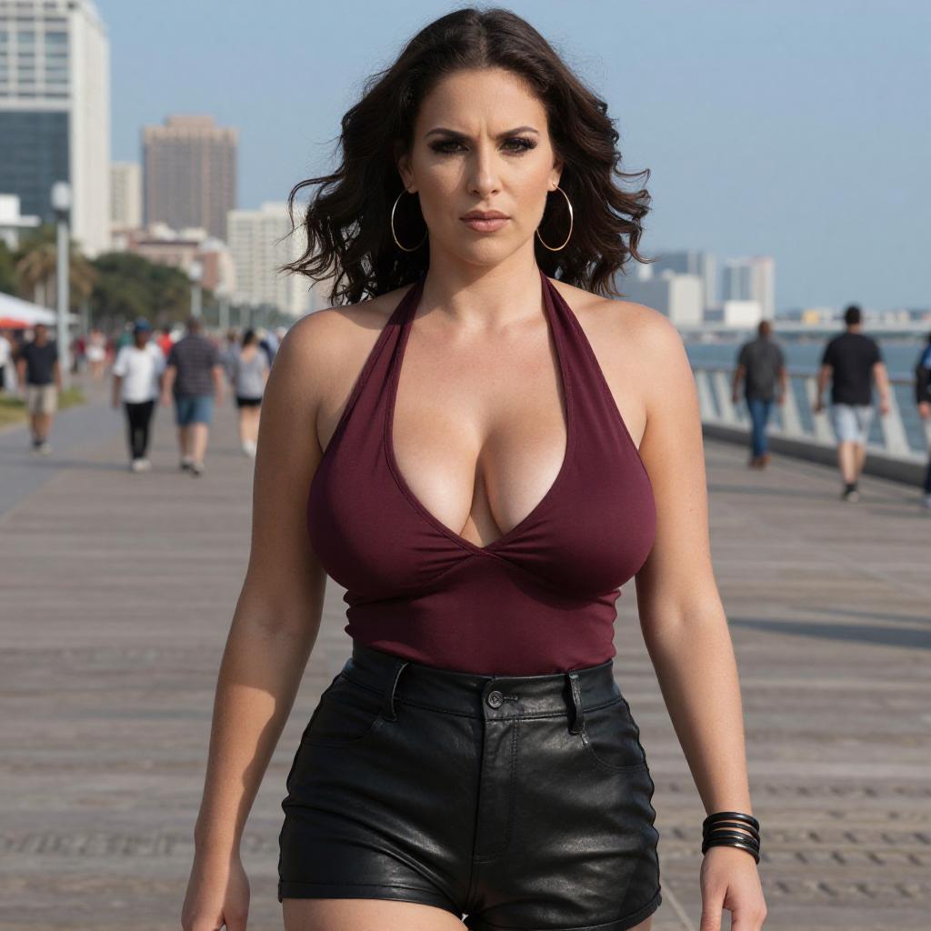 Photograph of a confident, curvy woman with fair skin and dark, wavy hair walking on a sunny, urban waterfront boardwalk. She wears a deep burgundy halter top with a plunging neckline, accentuating her large breasts, and black, high-waisted leather shorts. She has large hoop earrings and a black wristband on her right wrist. The background includes blurred pedestrians, high-rise buildings, and a clear blue sky. The boardwalk has a patterned pavement, and the waterfront is visible to the right. The woman's intense gaze and strong posture dominate the image.