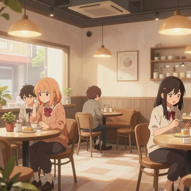 Anime art ai art generator designing cozy café interior with anime characters interacting, warm ambient light, detailed décor with soft pastel tones, AI-created textures adding depth to clothing and environment, capturing the slice-of-life genre with a modern digital art twist