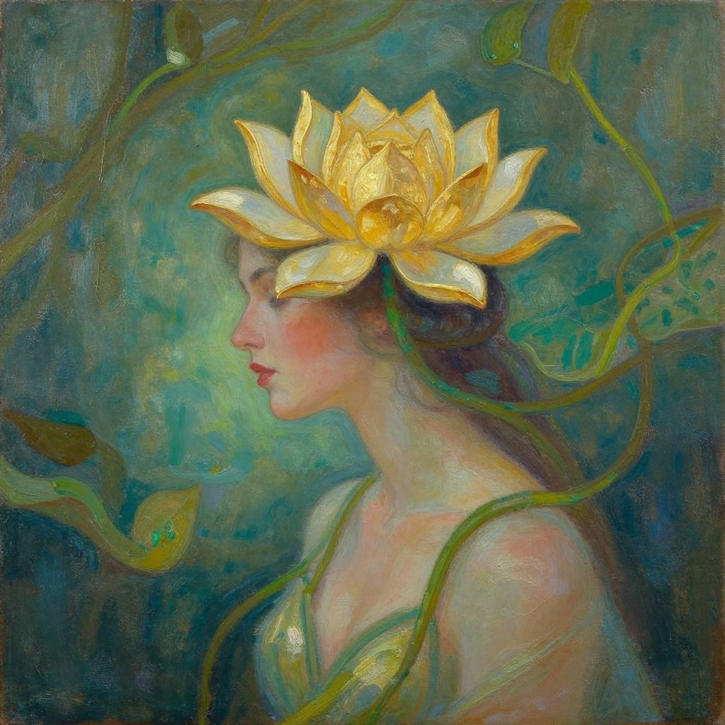Impressionist painting of a fair-skinned woman with a golden lotus flower crown, surrounded by green vines, set against a blue-green background.