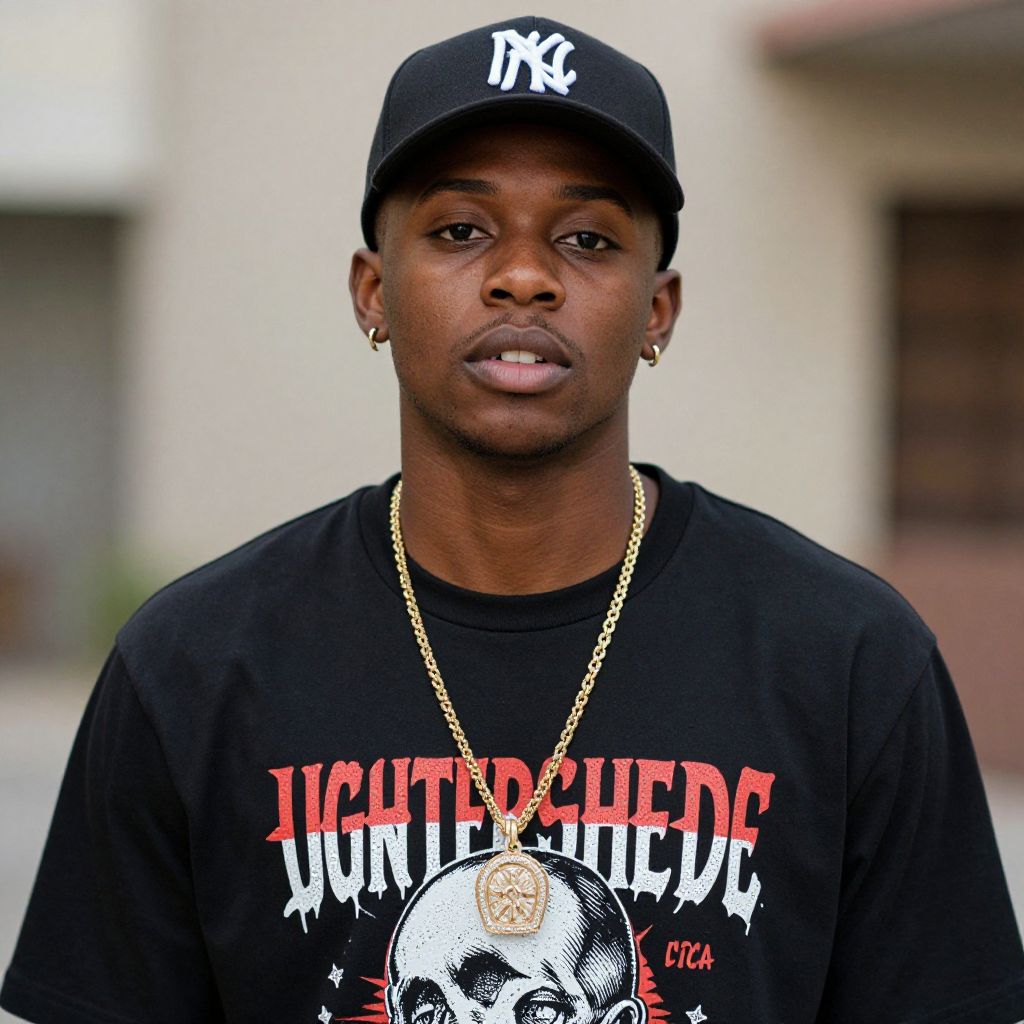 "hip hop album shirts, 1boy, solo, male focus, jewelry, hat, dark-skinned male, necklace, realistic, baseball cap, dark skin, shirt, glasses, looking at viewer, facial hair, print shirt, indoors, upper body, white headwear Realistic photo of casual sexy person with pretty face"