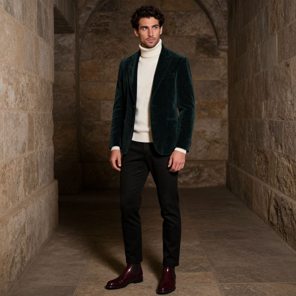 A man, dark green velvet blazer, cream turtleneck sweater, black slim fit trousers, burgundy leather Chelsea boots, ancient stone walls, dimly lit passageways, cinecolor, contemplative expression, stylish and sophisticated ambiance.Man has masculine face and piercing eyes