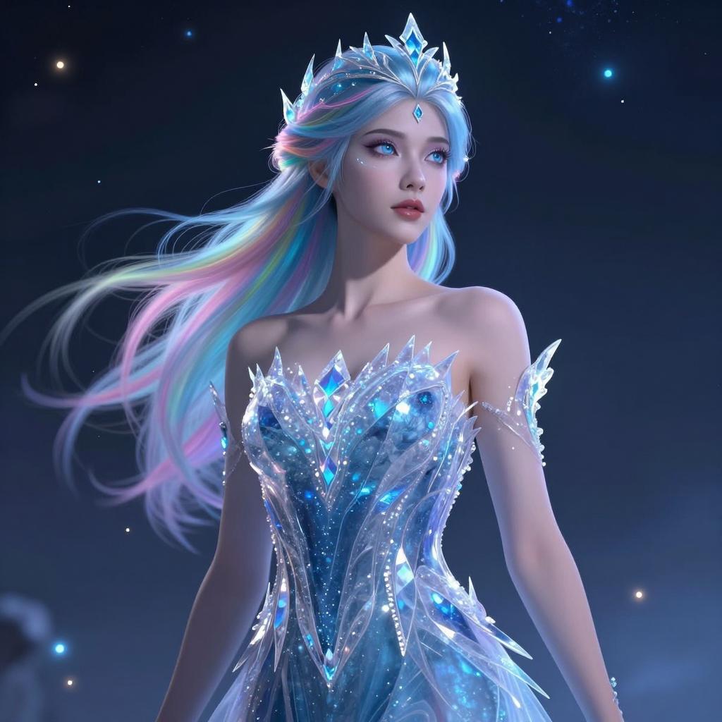 Digital artwork of a confident young female ice sorceress with glowing rainbow-colored hair and bare shoulders, wearing an elaborate frost-themed gown with translucent icy textures. The background features a starry night sky with glowing sparks and a magical atmosphere, rendered in high-quality fantasy art style.