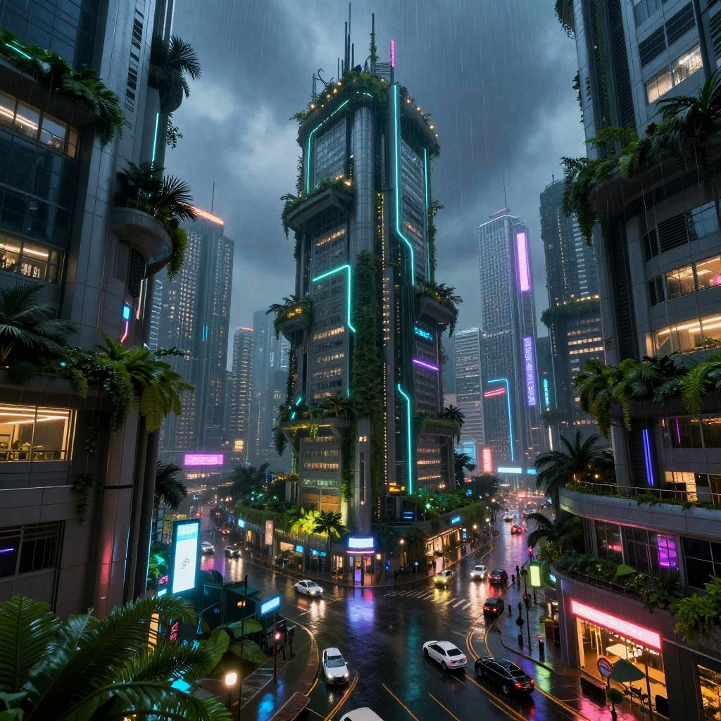 A free AI digital art generator producing stunning sci-fi cityscapes at dusk, with towering skyscrapers, neon lights, flying vehicles, and a reflective wet street, highly detailed, cyberpunk style, dynamic lighting, and atmospheric depth