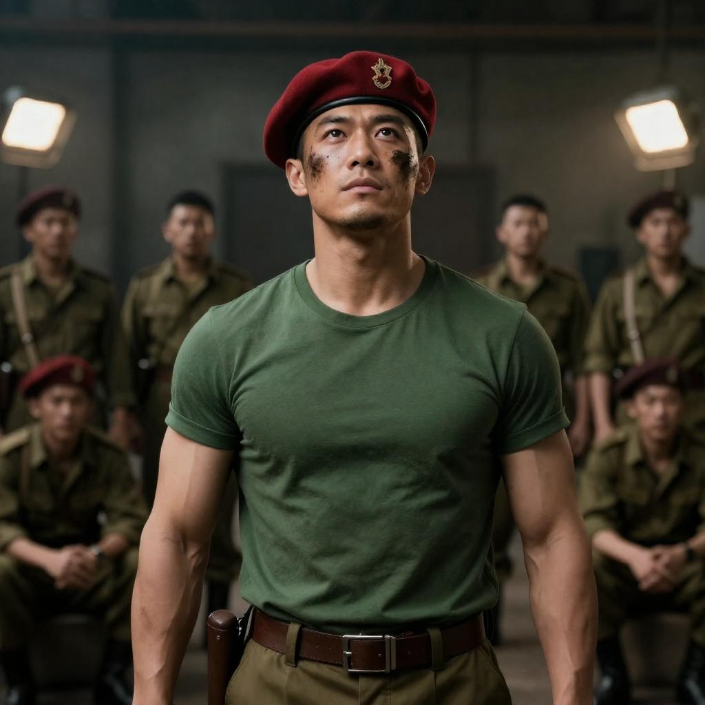 Photograph of a muscular man with a red beret, green t-shirt, and mud on his face, looking upward. Background includes dimly lit industrial setting with six men standing and sitting, wearing military-style clothing. Bright lights in background.