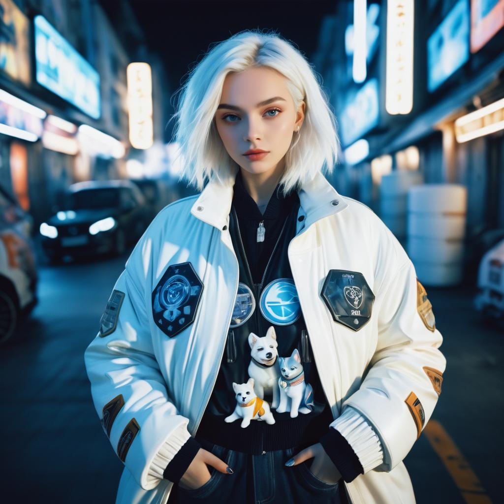 Portrait of a pale-skinned young woman with white hair standing in a neon-lit urban street at night. She wears a white oversized jacket adorned with multiple logo patches and a black inner jacket decorated with dog figurines. The scene features cinematic lighting with a cool blue tone, highlighting a futuristic, tech-inspired atmosphere.