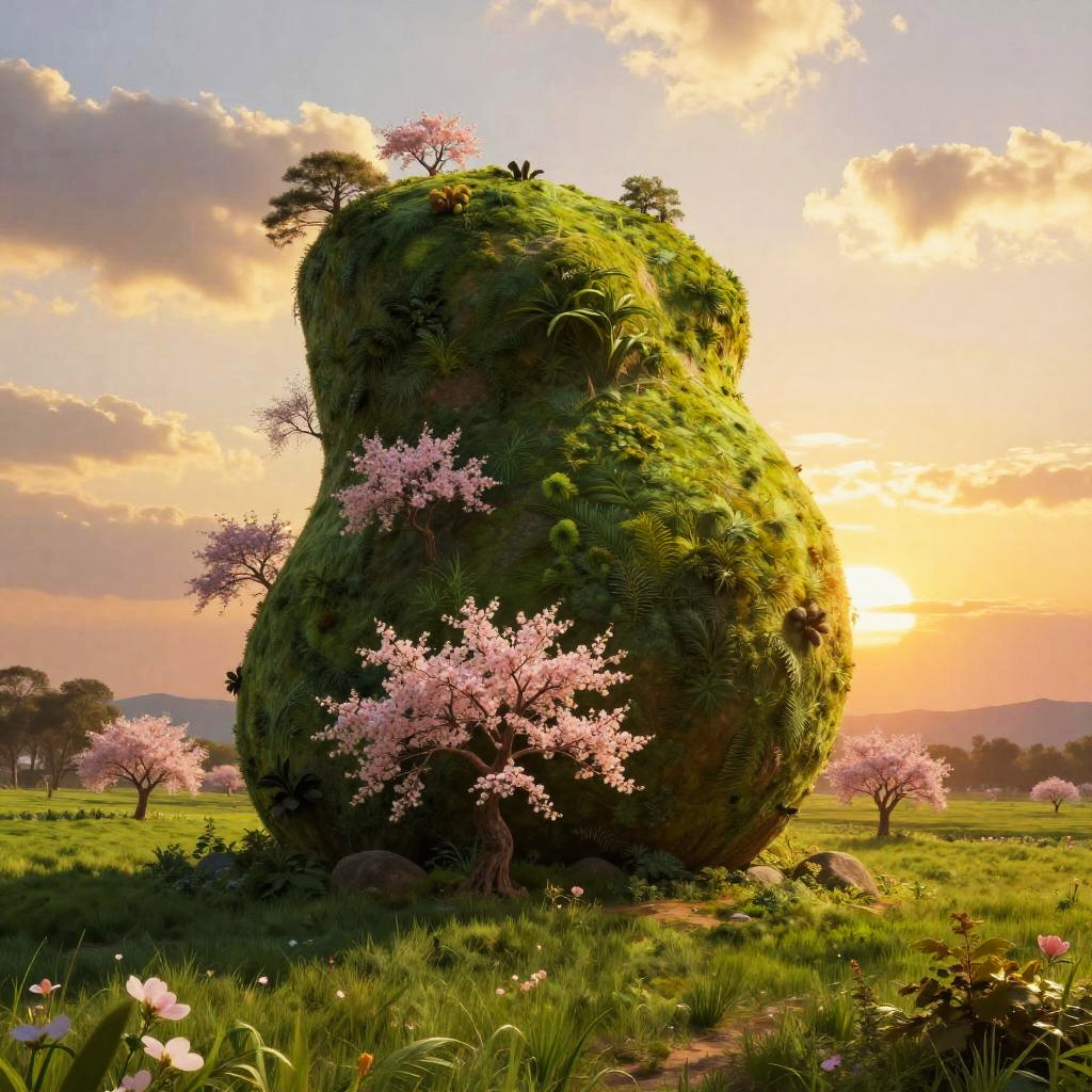 The biggest pregnant belly, depicted as a monumental natural element, resembling a round mountain covered in lush green fields and blossoming trees, under a golden sunset sky, highly detailed and vibrant digital painting.