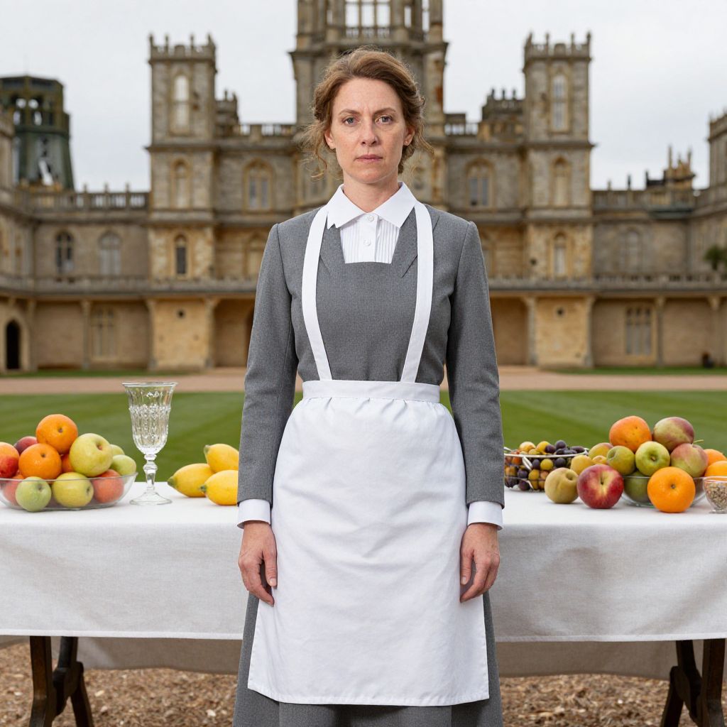 Downton abbey cook costume, woman in apron standing in front of a table of fruit