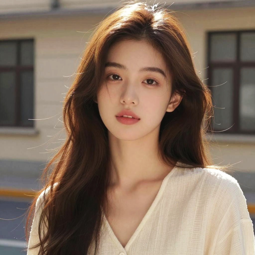 Photograph of a young Asian woman with long, straight black hair, fair skin, and brown eyes, wearing a white, textured blouse against a bright