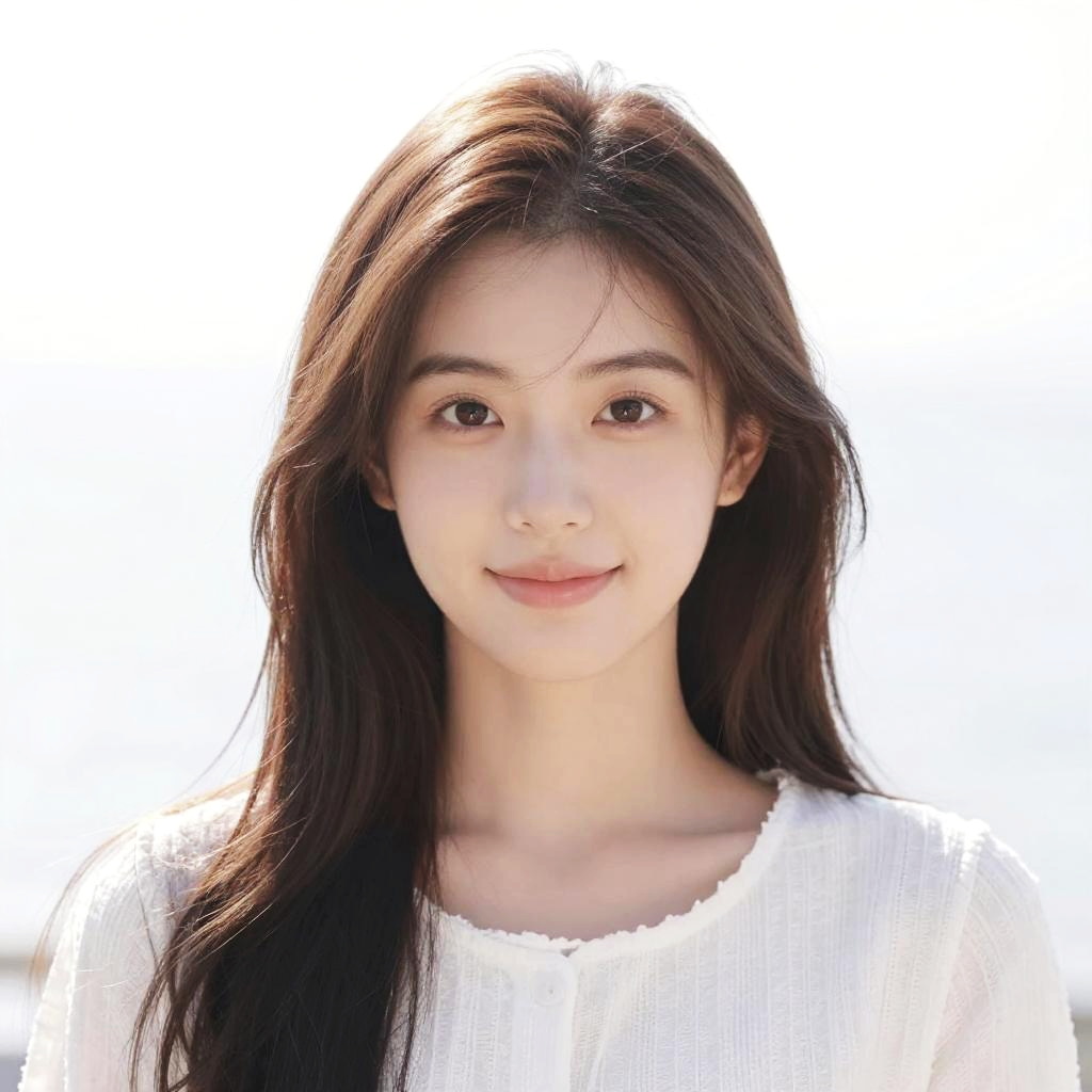 Photograph of an East Asian woman with long, straight, dark brown hair and fair skin. She has large, dark brown eyes and a slight, natural smile. She wears a simple, white, long-sleeve blouse with a subtle textured pattern. The background is bright white, making her the focal point of the image. The lighting is natural, highlighting her clear, smooth skin and soft facial features. The overall style is minimalist and portrait-focused, capturing her serene and gentle expression.