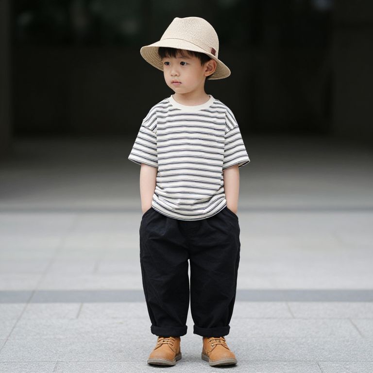 Photograph of a young Asian boy standing in a brightly lit, outdoor urban setting. He has light skin, short black hair, and is wearing a white, wide-brimmed straw hat with a brown band. His outfit consists of a white, short-sleeved, black-striped t-shirt, black, slightly baggy pants, and brown, lace-up shoes. His hands are casually in his pants pockets, and he gazes slightly to the side with a neutral expression. The background is blurred, featuring dark, indistinct structures and a light gray tiled floor. The overall composition highlights the boy's stylish, casual attire against the minimalist backdrop.