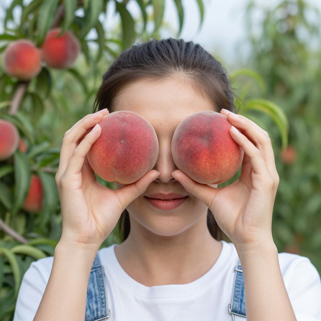Photograph of a young Asian woman with fair skin and dark brown hair, wearing a white t-shirt and blue denim overalls. She holds two large, red-orange peaches in front of her eyes, partially covering her face. Her expression is cheerful, with a subtle smile. The background is a lush, green peach tree with several ripe peaches. The image has a bright, natural light, and the peaches have a slightly fuzzy texture. The woman's hands are positioned centrally, and her hair is pulled back, highlighting her playful interaction with the fruit.