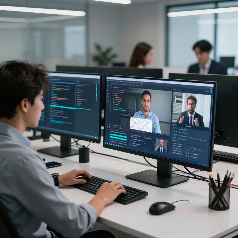 Multitarefa scene of a busy modern workspace with a professional managing emails, coding, and video conferencing simultaneously on multiple transparent screens, infused with futuristic UI elements, a sleek minimalist design, and ambient lighting to emphasize focus and efficiency.