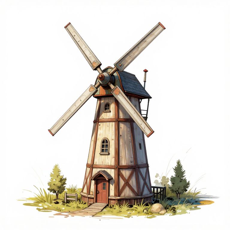 Synthwave very detailed product design sketch for a small wind turbine in the style of an old half-timbered mill.,