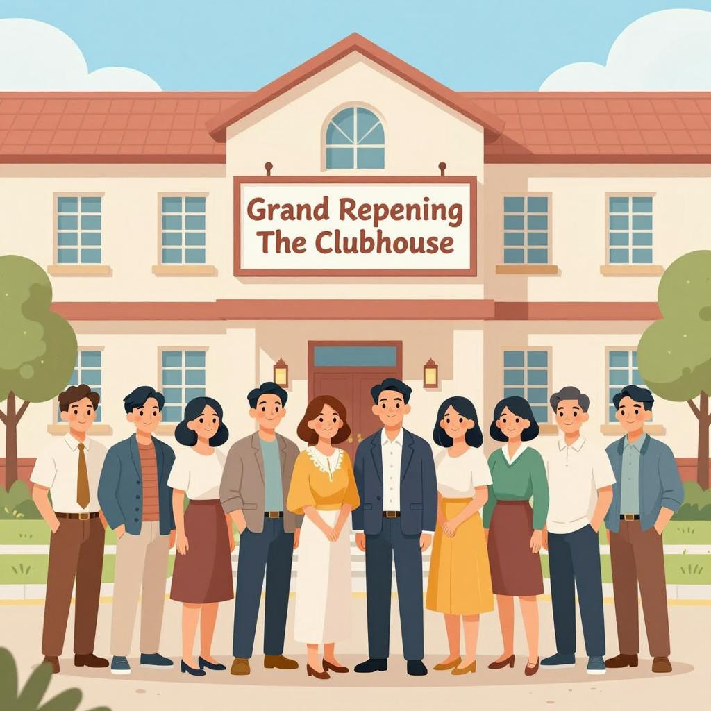 Illustration of a group of eight people in front of a grand building with a sign reading "Grand Reopening The Clubhouse."