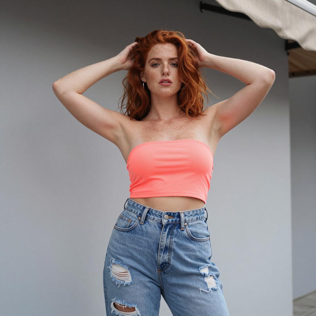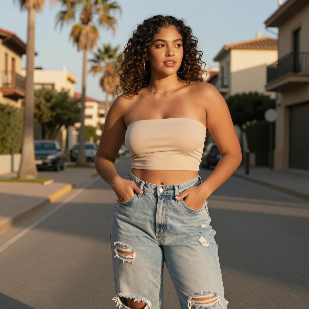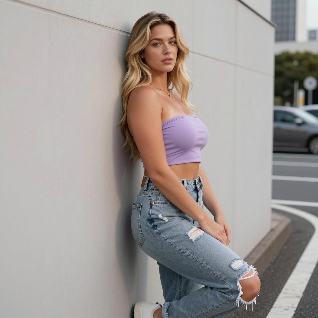 Woman in Lavender Bandeau and Ripped Jeans on Residential Street