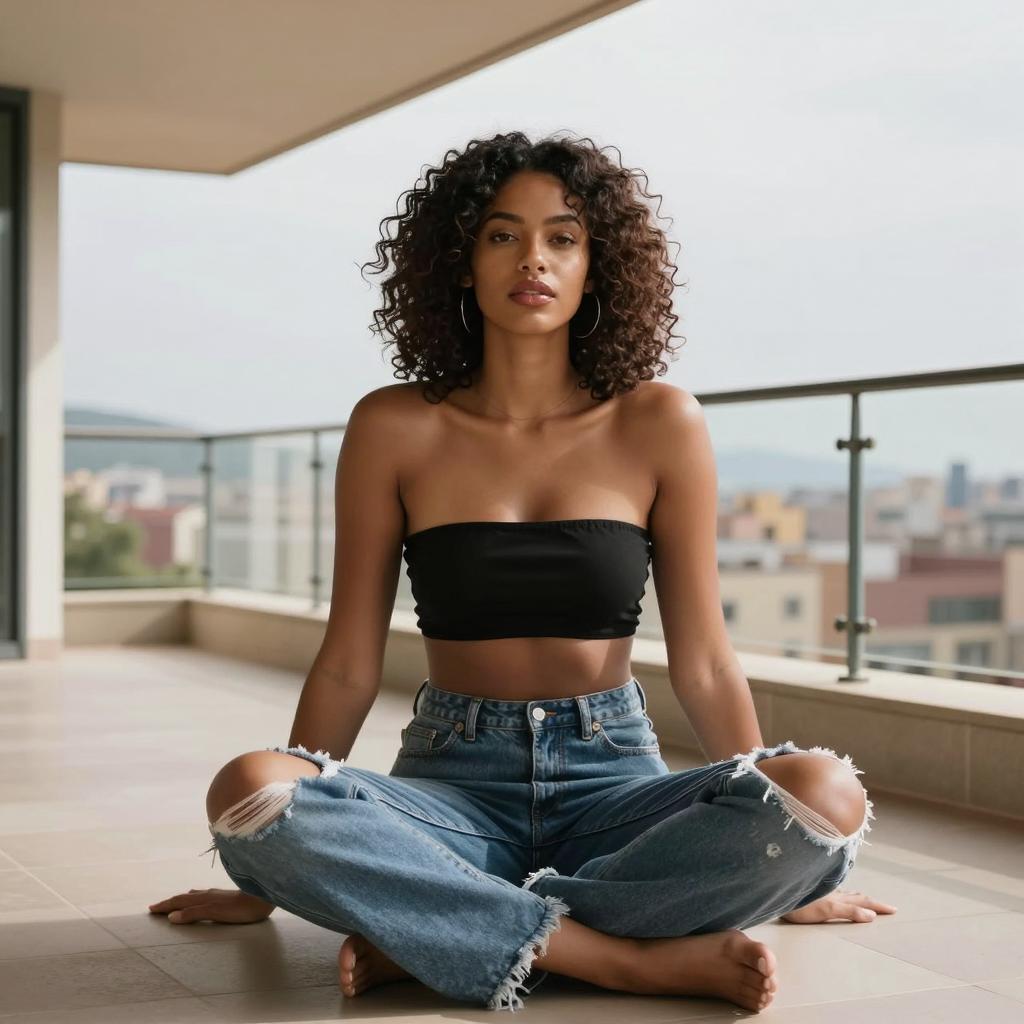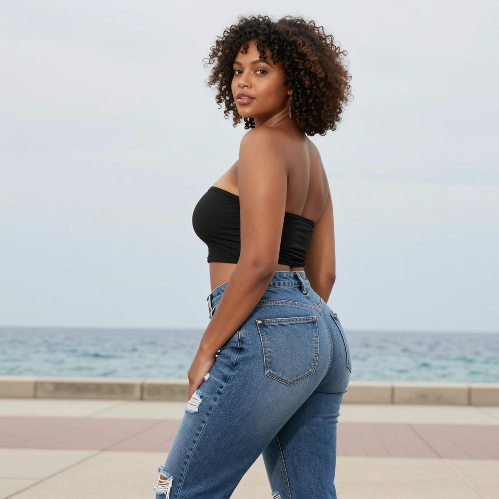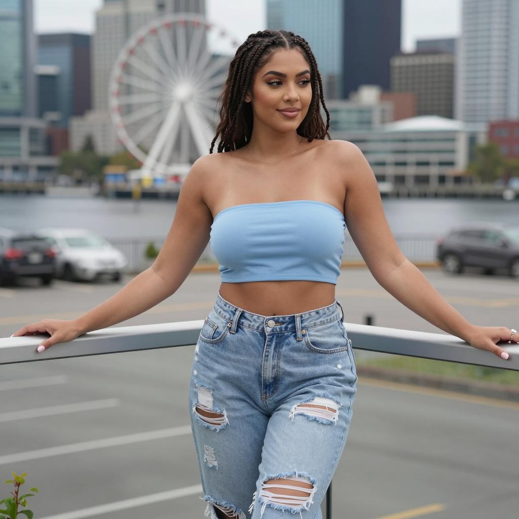 Woman in Lavender Bandeau and Ripped Jeans on Residential Street