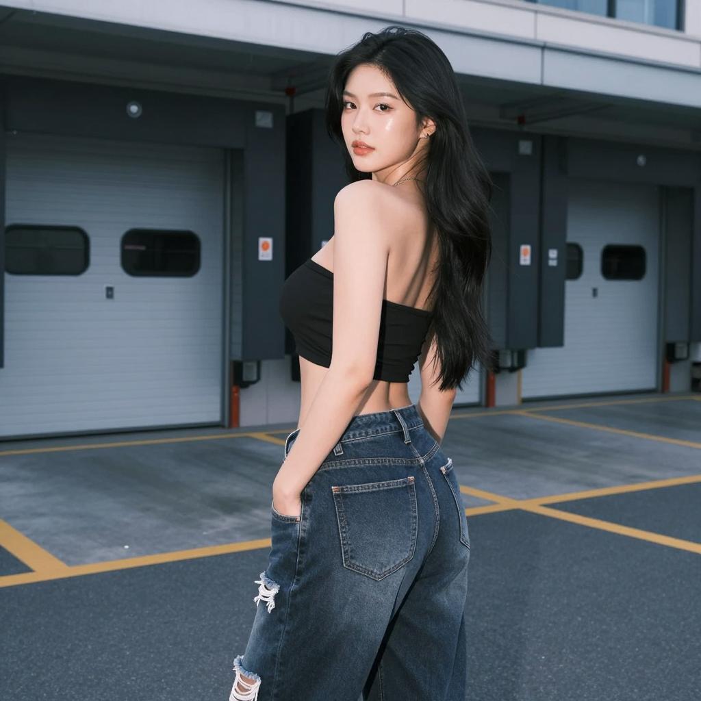 1girl, woman, large breasts, wearing ultra-short bandeau crop top and high-waisted relaxed-fit ripped jeans in lavender top with grey washed jeans on mixed-heritage woman with wavy ombré hair and soft glam posed standing with both hands raised to adjust her hair, torso slightly twisted in residential street with palm trees and houses in the background at Marina Bay Sands promenade in Singapore under warm golden-hour light with long soft shadows and glow on skin, laid-back summer lifestyle fashion photography, high resolution, ultra-detailed