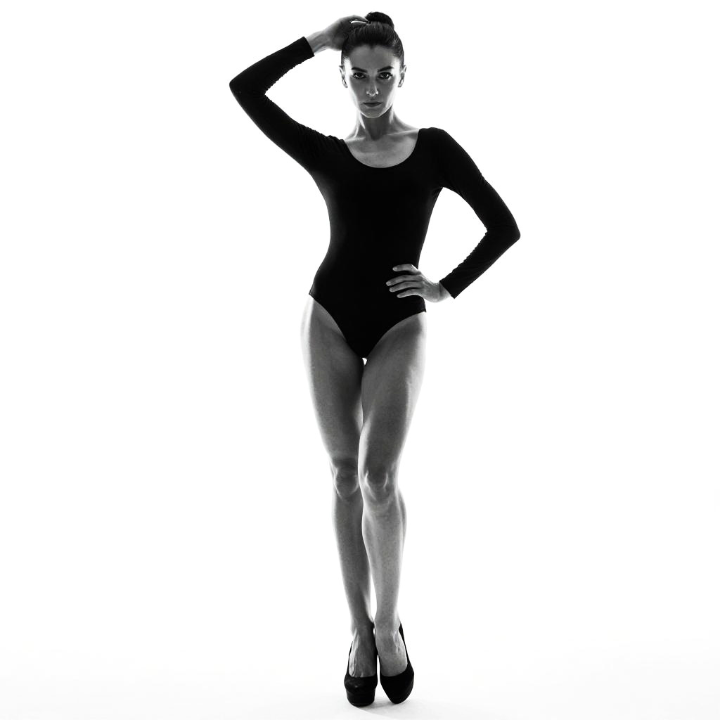 Photograph of a tall, slender woman with dark hair in a bun, standing against a bright white background that creates a dramatic black-and-white effect. She's wearing a tight, long-sleeve black leotard and black high heels, with one hand resting on her head and the other on her hip. Her confident pose and intense gaze dominate the image, with subtle shadows adding depth.