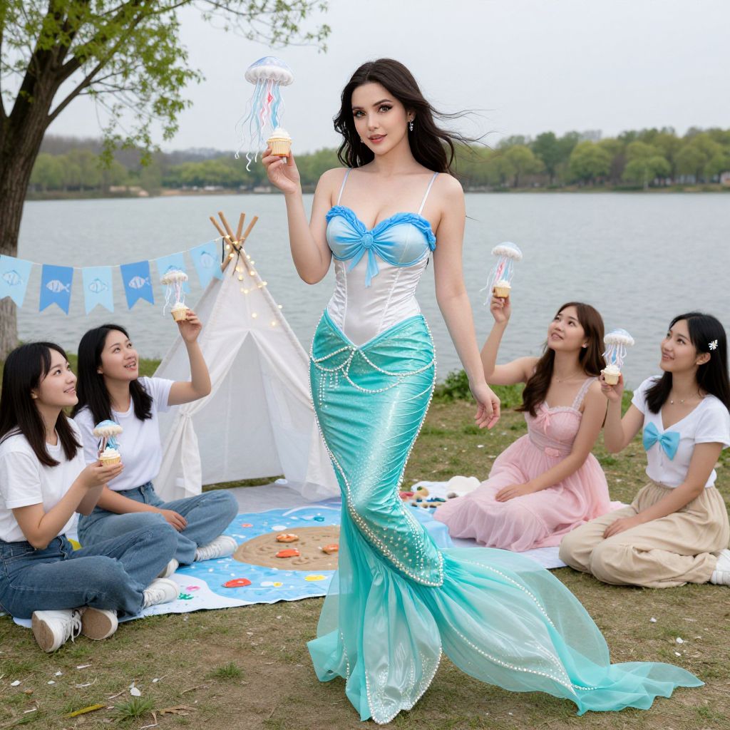 A whimsical outdoor mermaid birthday party by a lake during springtime. A luscious woman with dark brown hair, piercing hazel eyes, and soft facial features wears a realistic mermaid costume — a delicate blue and white bodysuit, a tail with glowing pearls along the edges, and flowing sea-green fabric that catches the breeze. She is laughing with a group of friends as they raise cupcakes shaped like jellyfish, and the setting includes a small tent with string lights, paper fish banners, and a sand art mural of ocean creatures.. The woman has big breasts and cute face