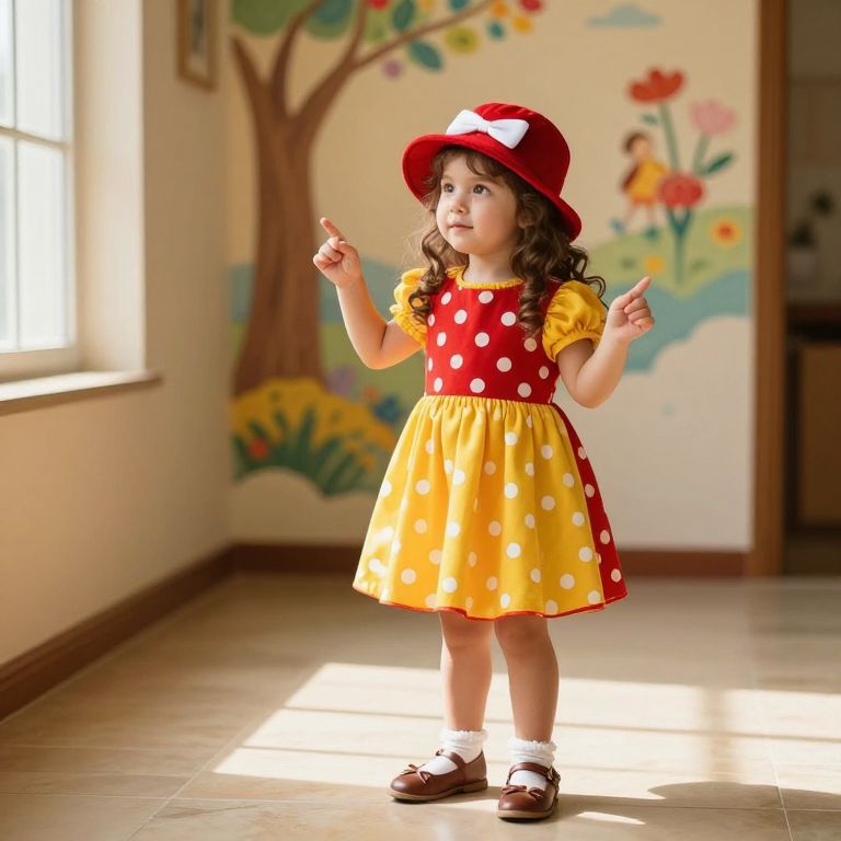 A young girl with long curly brown hair, wearing a vibrant red and yellow dress with white polka dots and a matching red velvet hat with a white bow, stands confidently on a clean, polished tiled floor. The room is softly lit with warm golden sunlight streaming through a nearby window, casting gentle shadows. The girl has a bright, curious expression, her hands slightly raised as if pointing toward a colorful mural on the wall behind her. The scene is detailed and lively, with a touch of whimsy and charm.
