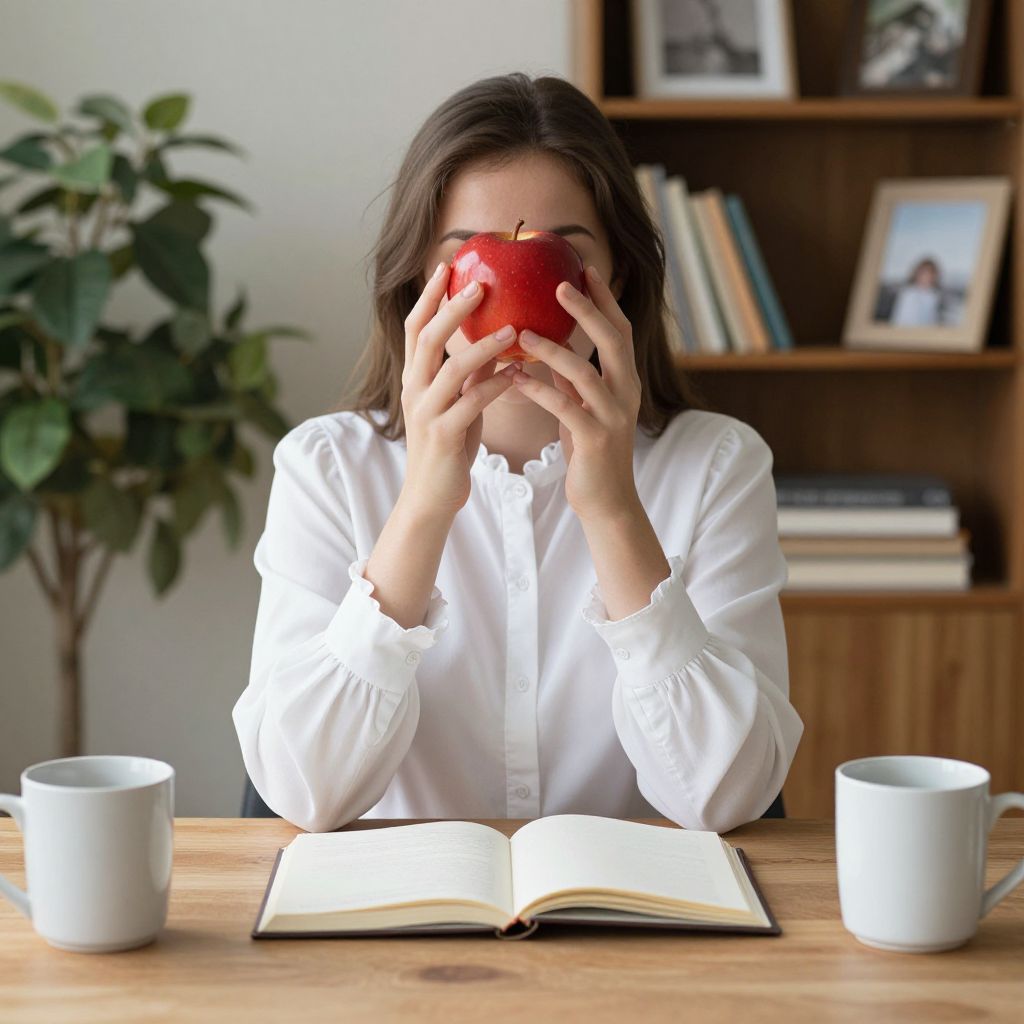 Woman seated at a wooden desk, holding a vibrant red apple between her hands while wearing a crisp white blouse with ruffled cuffs, surrounded by a cozy indoor setting featuring a potted plant to the left, a bookshelf with books and framed pictures in the background, and two white mugs flanking an open notebook on the desk.