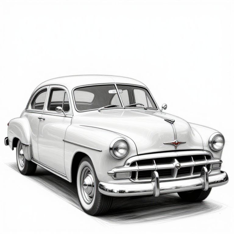 Controlnet sketch of a classic vintage car from the 1950s, detailed with precise linework focusing on curves, reflections, and mechanical components, rendered in monochrome with a blend of smooth shading and sharp highlights.