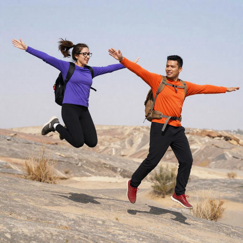 Man with red shirt, beige shorts, black backpack, and hat jumps across rocky desert terrain. Clear blue sky with large white cloud in background. He has black shoes and a determined expression. Mid-jump, legs and arms extended. Single person.