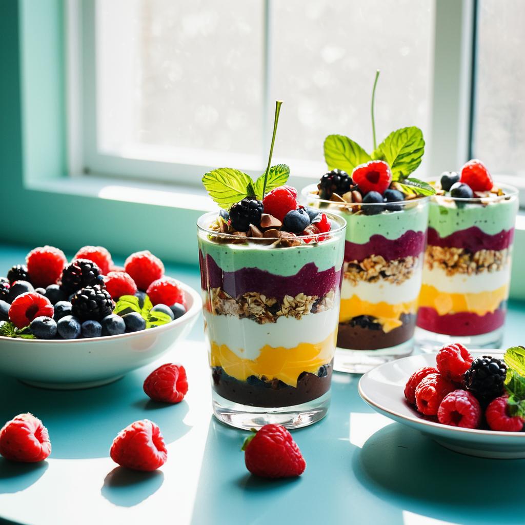 White Balance photograph of a happy and colorful breakfast spread featuring a variety of Greek yogurt with pomegranate seeds, honey drizzle, almonds, bright and bold colors to create a lively atmosphere. Studio lighting with a sharp focus 100mm F1.2 lens creating crisp highlights.