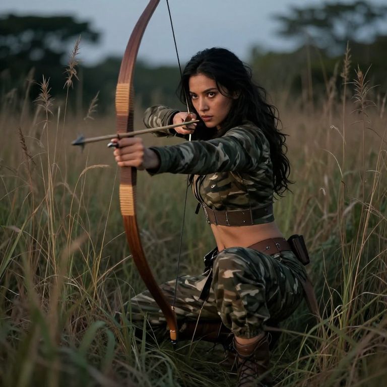 Photograph of a focused woman with long black hair, wearing camouflage military attire, kneeling in tall grass, drawing a wooden bow in a natural, dusk
