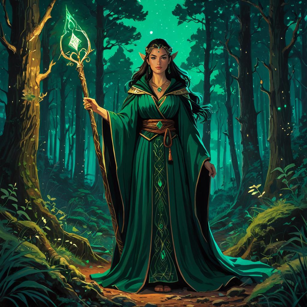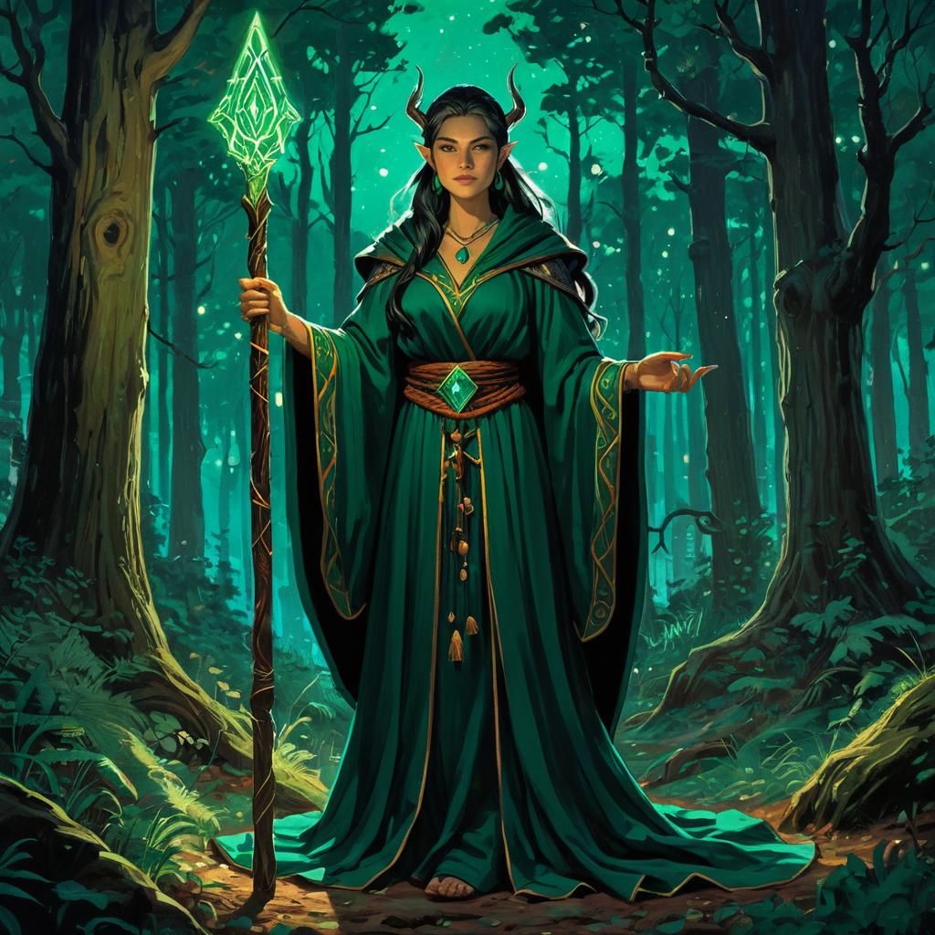 Forest Sorceress with Glowing Staff in Enchanted Woodland