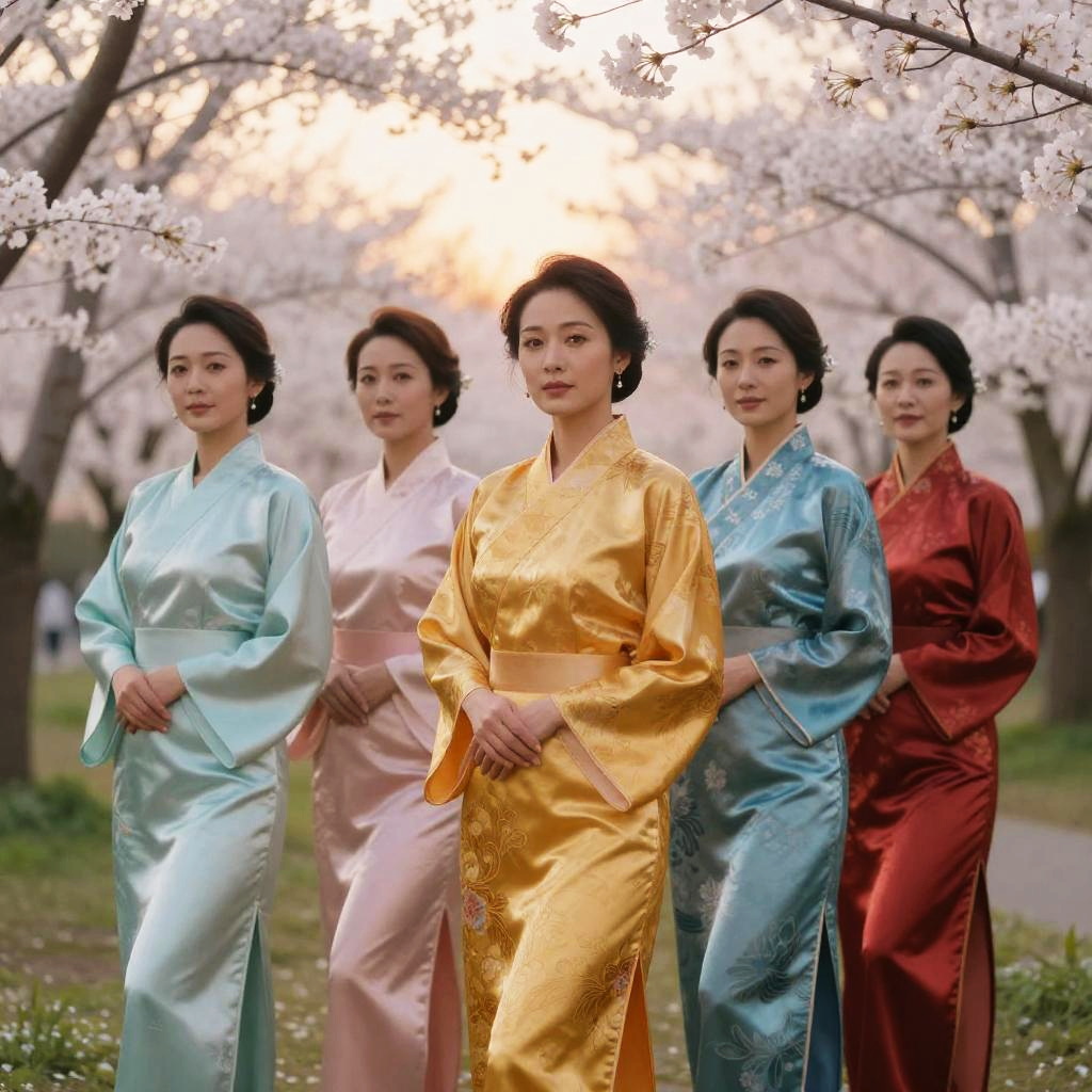 Breathtaking Asian women in vibrant traditional silk dresses standing gracefully in a serene cherry blossom garden under soft golden sunset light, detailed and elegant.