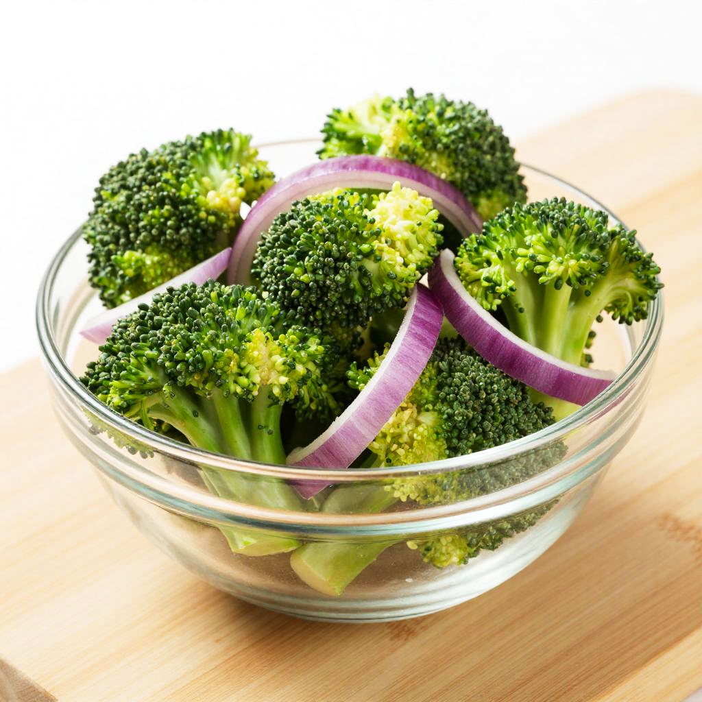 Photograph of a clear glass bowl filled with vibrant green broccoli florets and slices of purple onion. The broccoli's dense, bumpy texture contrasts with the onion's smooth, circular slices. The bowl is centered on a wooden surface with a light brown, grainy texture. The white background highlights the bright colors of the broccoli and onion, making them stand out. The image is brightly lit, emphasizing the freshness and natural colors of the vegetables.