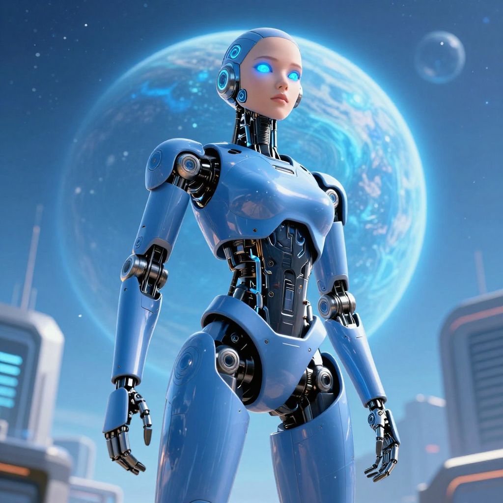 Digital illustration of a humanoid female robot with blue glowing eyes and sleek blue mechanical body, viewed from below. The android stands against a backdrop of a bright, swirling blue alien planet and futuristic urban architecture, showcasing distinct mechanical joints and a modern sci-fi design.