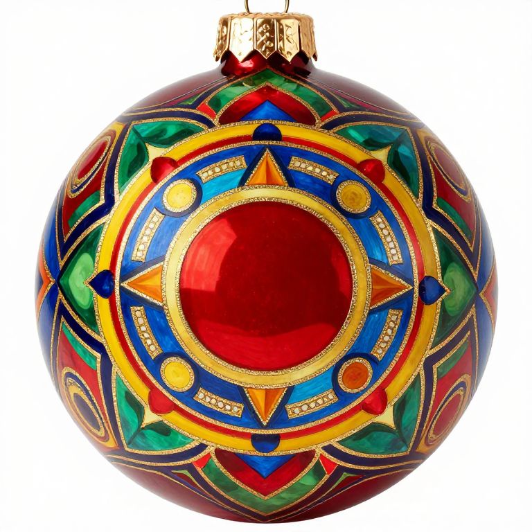 The image depicts an ornate Christmas ball ornament, perfectly symmetrical and vibrant in the style of Paul Klee. The ornament features a rich array of colors, including shades of red, blue, green, yellow, and gold, arranged in a complex, interlocking pattern. The central design is a large, red circle surrounded by a series of smaller, concentric circles in various colors, creating a sense of depth and dimension. Surrounding this central motif are symmetrical geometric shapes, including triangles, squares, and ovals, each filled with intricate patterns and textures. The overall composition is balanced and harmonious, with the colors and shapes interacting in a visually engaging manner. The ornament's surface appears smooth and glossy, reflecting light and adding to its three-dimensional appearance. The design is both intricate and balanced, showcasing a high level of craftsmanship and artistic skill.