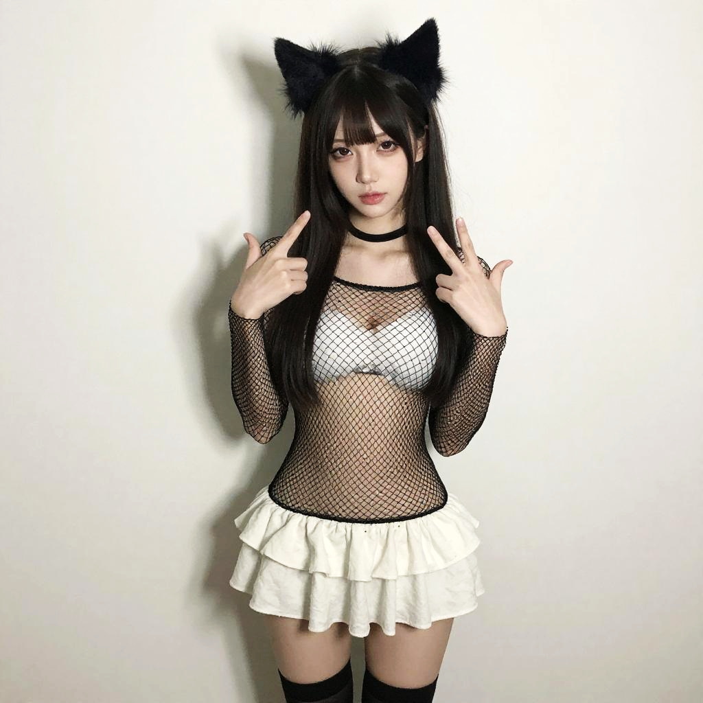 Egirl, high quality fingers, normal hands, detailed fingers, masterpiece, (realistic, photo-realistic:1.37), medium breast, small waist, beautiful face, perfect illumination, beautiful detailed eyes, looking at viewer, stunningly beautiful woman, detailed hairstyle, egirl in gamergirl room, ((black ruffle skirt)), choker, cat ears, ((laced crop top)), sitting on bed, spread legs, white hair