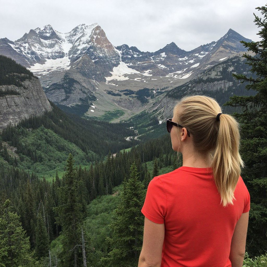 Blonde-haired woman wearing sunglasses and a red shirt stands with her back to the camera, gazing at the majestic snow-capped peaks of Montana's Glacier National Park, surrounded by lush green valleys and evergreen trees.