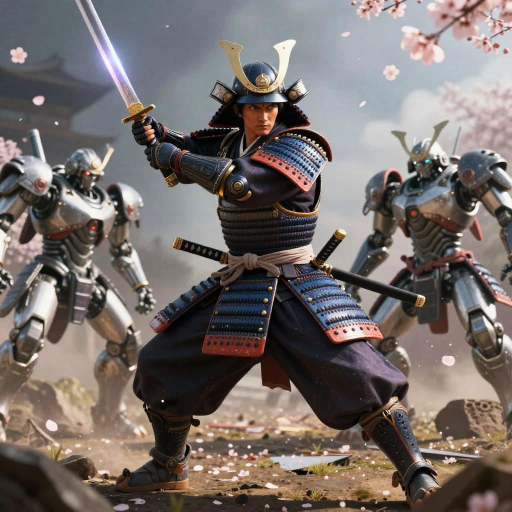 Girugamesh depicted as a fierce samurai in traditional armor with modern sci-fi enhancements, wielding a glowing katana amidst a battlefield of robotic foes, cherry blossoms falling, dramatic lighting, dynamic action pose.