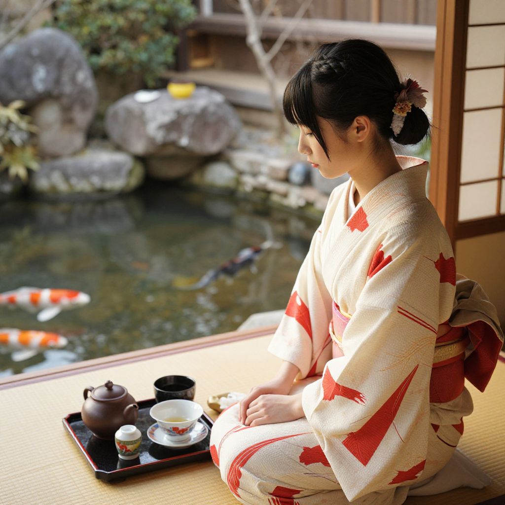 Japanese girl in box, surrounded by origami flowers, wearing vibrant yukata, warm sunlight filtering through shoji screens, peaceful and dreamlike