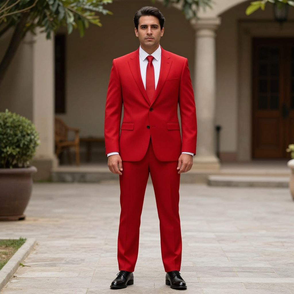 Photograph of a young man standing in a courtyard. He has short, dark hair and a serious expression. He wears a bright red, tailored suit with a white dress shirt and a red tie. His black dress shoes are polished. The background includes a beige building with columns, a large potted plant on the left, and a wooden door on the right. The courtyard has a tiled floor with a grassy edge on the left. The image has a sharp focus on the man, with a slightly blurred background. The lighting is natural, suggesting an outdoor setting.