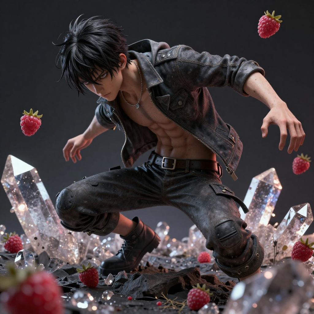 Dark and gritty, japanese manga (hero:1.55) borax crystal, dynamic pose, raspberry lights, realistic, glow, detailed textures, high quality, high resolution, high precision, realism, color correction, proper lighting settings, harmonious composition, behance work, very dramatic lighting, sharp focus, low angle, trending on artstation, studio photo, intricate details, highly detailed
