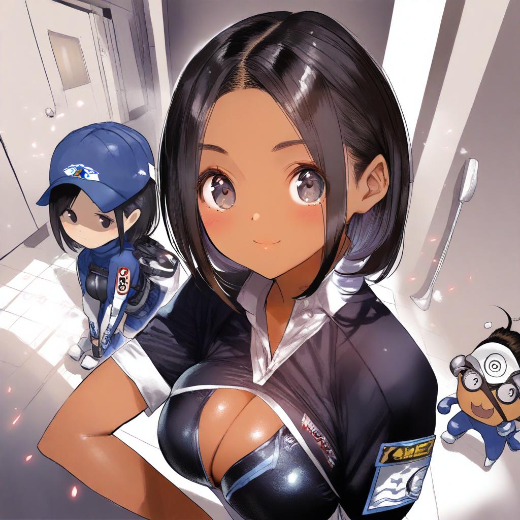 Arung samudra (cessa), ombok diving and delivery services, 1girl, dark-skinned female, black eyes, black hair, short hair, large breasts, cleavage, by artist yuugen, animagine