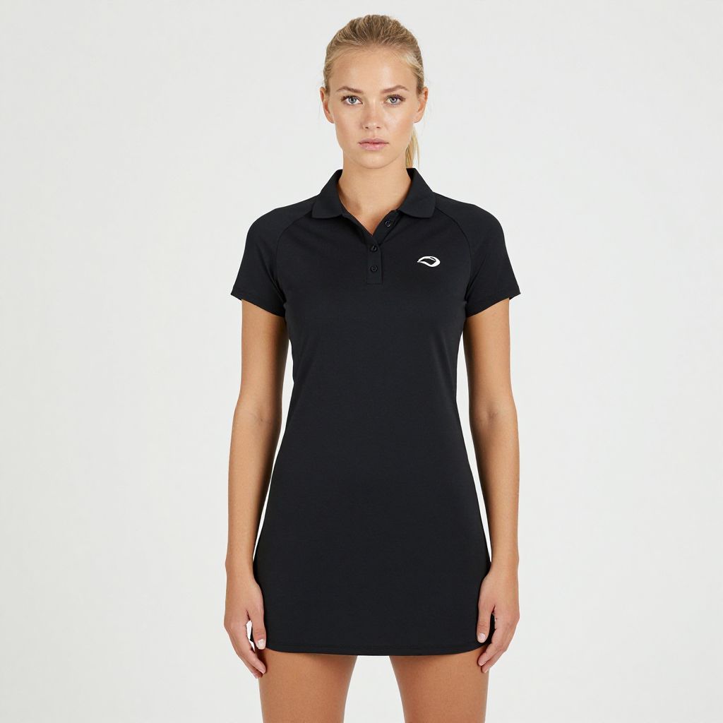 Photograph of a young, blonde woman standing against a plain white background. She has a serious expression, light skin, and her hair is tied back in a ponytail. She's wearing a short-sleeved, black athletic polo dress with a small white logo on the left chest. Her arms are relaxed by her sides, and she's standing straight. The lighting is even, highlighting her athletic build.