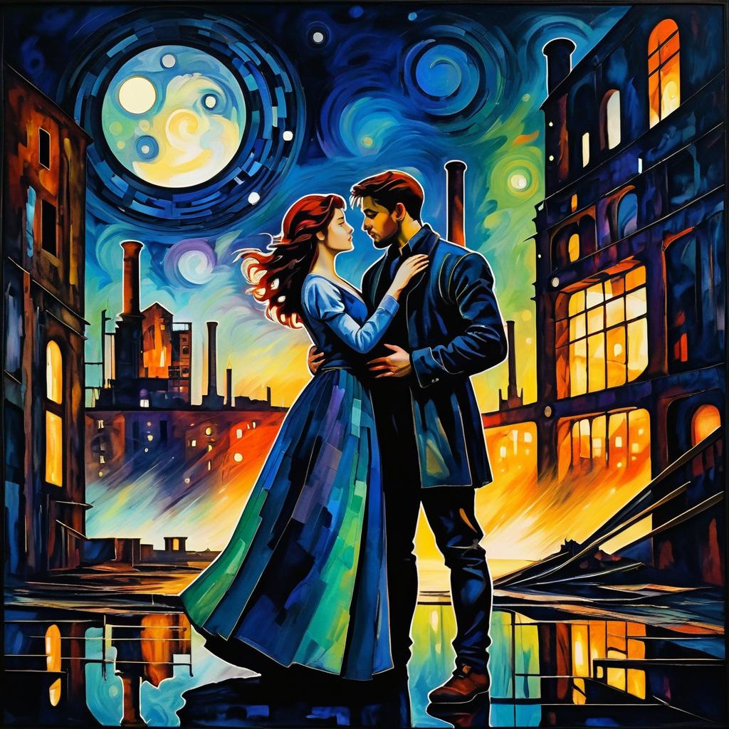 Expressionist-style artwork of a young couple during the Industrial Revolution, embracing in a moonlit dilapidated factory, style inspired by Edvard Munch, Wassily Kandinsky, mystical and romantic atmosphere
