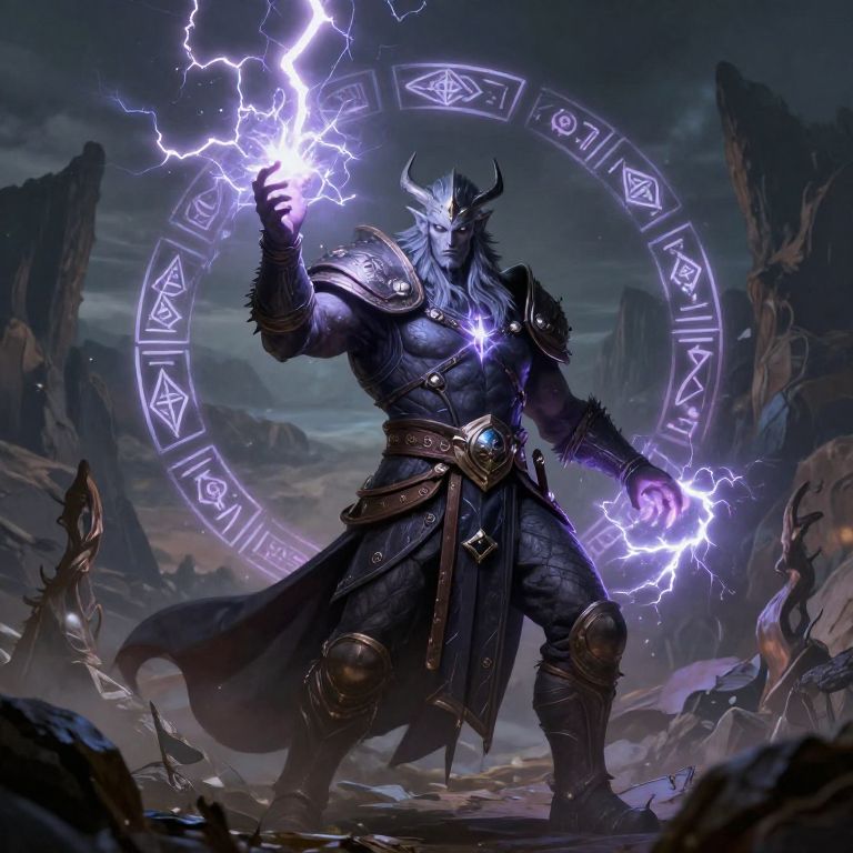 A digital fantasy artwork depicts a muscular, dark-skinned, horned demon warrior standing amidst a rocky, stormy landscape. The demon, clad in dark, armored attire with glowing blue runes and a belt with a large, ornate buckle, unleashes bright purple lightning from both hands. A circular, glowing rune circle hovers behind him, illuminated by the lightning. The background features jagged, towering rocks under a dark, stormy sky. The demon's fierce expression and powerful stance are central, with debris scattered around his feet, adding to the dramatic atmosphere. The overall style is highly detailed and dynamic, emphasizing the supernatural and epic nature of the scene.