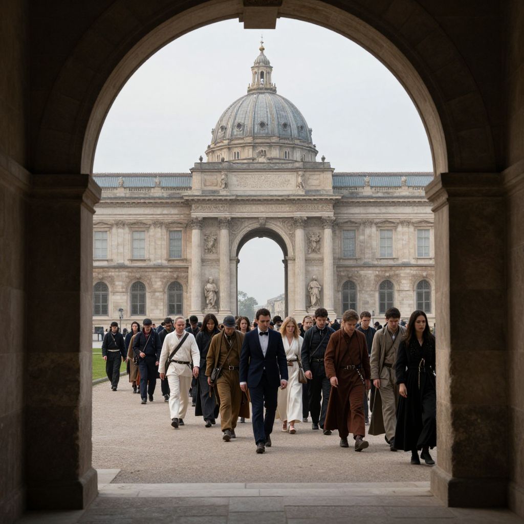 Through the archway of time, a silent procession of past and future converges, where the weight of history meets the promise of exploration, casting a poignant reflection on the enduring human quest for discovery and connection.